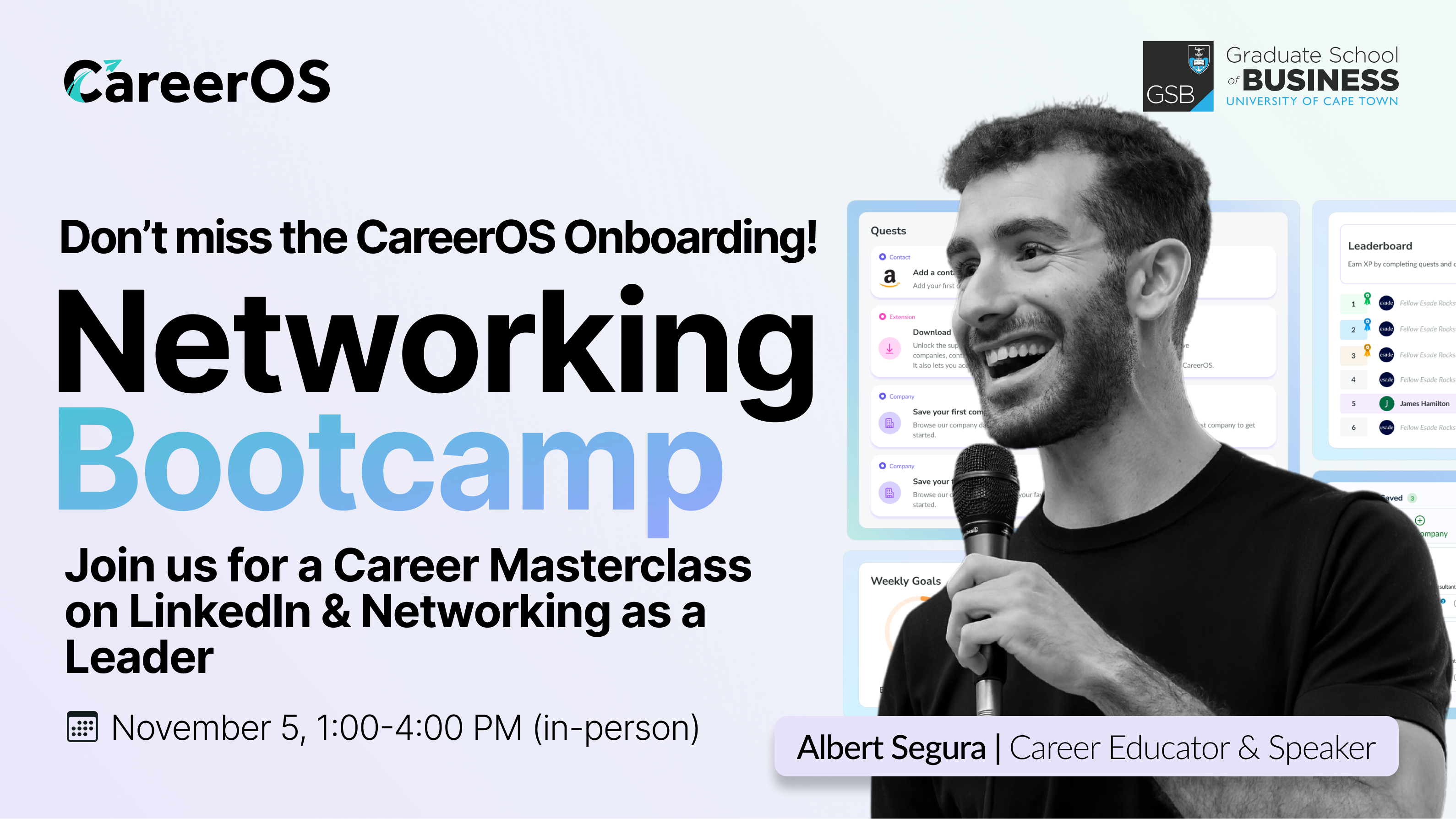 Following the masterclass, you’ll dive into the CareerOS Onboarding, where you’ll discover CareerOS (https://app.thecareeros.com/), your new UCT GSB AI-powered career platform trusted by top international universities and your personal networking partner throughout the MBA and as an alumni. In this session, you’ll get access to your exclusive premium CareerOS and learn how to:
