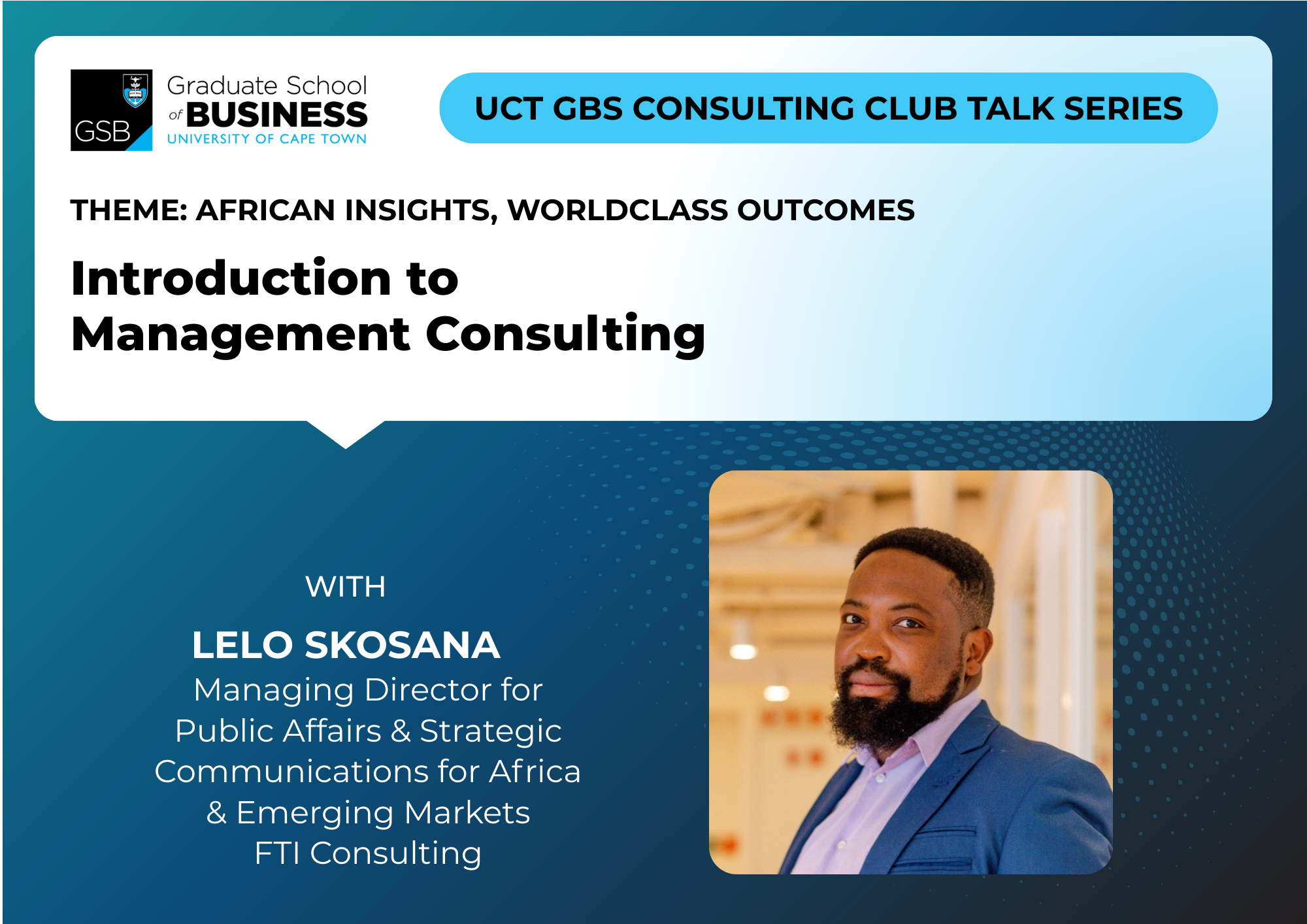 The “Introduction to Management Consulting” talk, hosted by the UCT GSB Consulting Club, is an orientation session designed to give students a grounded overview of the consulting industry. Led by Lelo Skosana (Managing Director, FTI Consulting), the session draws on real-world advisory experience across public affairs, strategic communications, and economic development to unpack how consulting operates at the intersection of business, government, and markets.